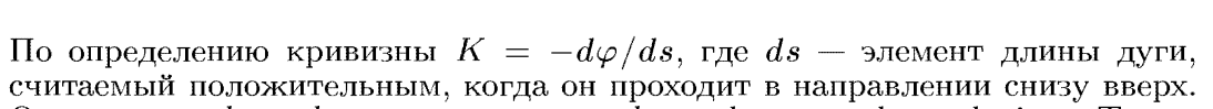Если радиус кривизны определяется как R=\frac{(1+y'^2)^{3/2}}{y''} и кривизна поидее должна быть K=\frac{y''}{(1+y'^2)^{3/2}}. Отсюда следует, что K=\frac{1}{R}=\frac{d\varphi}{ds}, но что же насчет знака? Я так предполагаю, что если мы отсчитываем угол против часовой, тогда у нас угол положительный и соответственно дуга проходит снизу вверх, а когда мы считаем угол против часовой то угол отрицательный, а дуга проходит сверху в низ.