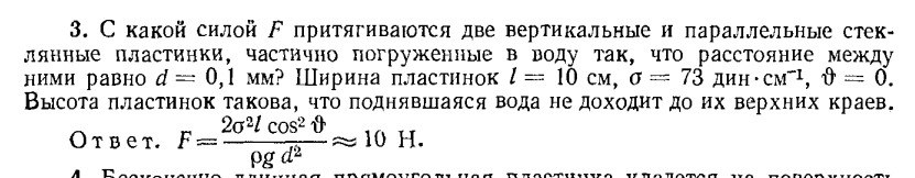 С какой силой F притягиваются две вертикальные и параллельные стеклянные пластинки, частично погруженные в воду так, что расстояние между ними равно d = 0,1 мм? Ширина пластинок L = 10 см, \sigma= 73 дин/см, краевой угол равен нулю. Высота пластинок такова, что поднявшаяся вода не доходит до их верхних краев.