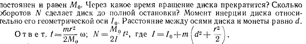 - Диск и монета остановятся одновременно, поэтому угловую скорость монеты и диска вместе, я думаю, искать нет надобности. Запиши связь между моментами сил и моментом импульса для монеты.