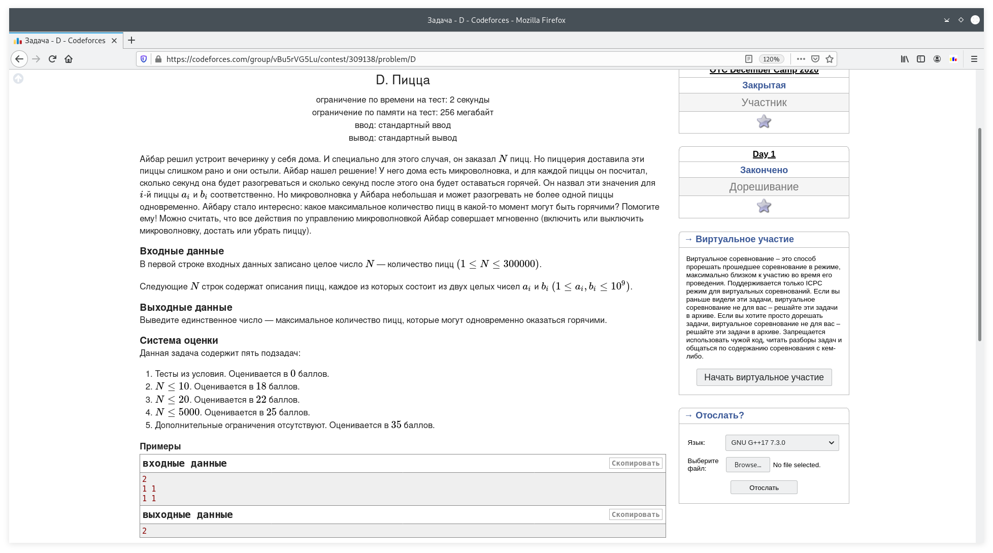 Перед тем как решать задачу подумаем о популярной задаче о дедлайнах. Нам дано два массива t и d, мы выполняем работу i за t_i и мы должны её закончить до d_i. Нам нужно максимизировать кол-во выполненных работ. Если мы выбрали работы i_1, i_2, i_3, i_4, ..., то тогда можно будет переставить их так чтобы выполнялось d_{i_1} \leq d_{i_2} \leq d_{i_3} \leq ...
