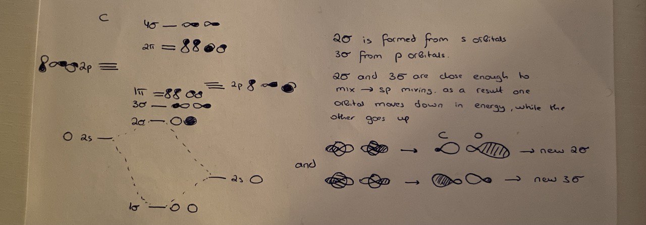 3\sigma орбиталь без sp-mixing лежит гораздо ниже по энергии и имеет немалый вклад 2р орбиталей кислорода. Но когда включается sp-mixing c 2p углерода (он происходит, ЕМНИП, с 2\sigma и 3\sigma орбиталями, последние поднимаются по энергии ближе к 2р орбиталям углерода (и то, что они оказываются рядом с 2р кислорода это просто совпадение).