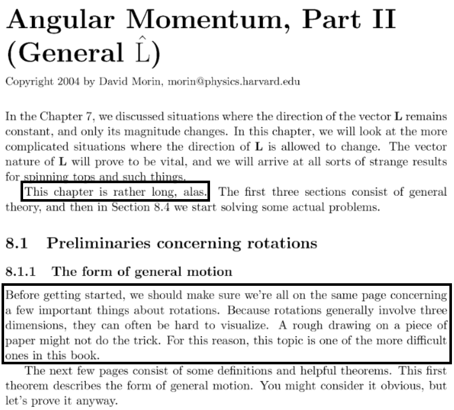 This problem requires rigid body motion problem solving skills. If you still haven’t covered Morin’s Chapter 8, then you should certainly do so. Still, the theory is quite hard to comprehend (even David Morin says so, look at pic below), but make sure you did memorize the derivation of every formula from this chapter and solved all the exercises and problems.