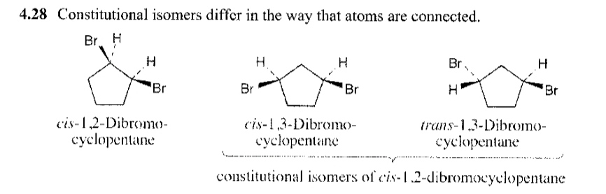 Draw two constitutional isomers of cis-1,2-dibromocyclopentane.
