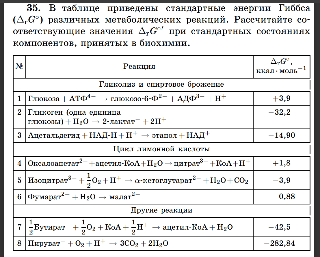 В таблице приведены стандартные энергии Гиббса (∆rG◦) различных метаболических реакций. Рассчитайте соответствующие значения ∆rG◦′ при стандартных состояниях компонентов, принятых в биохимии.