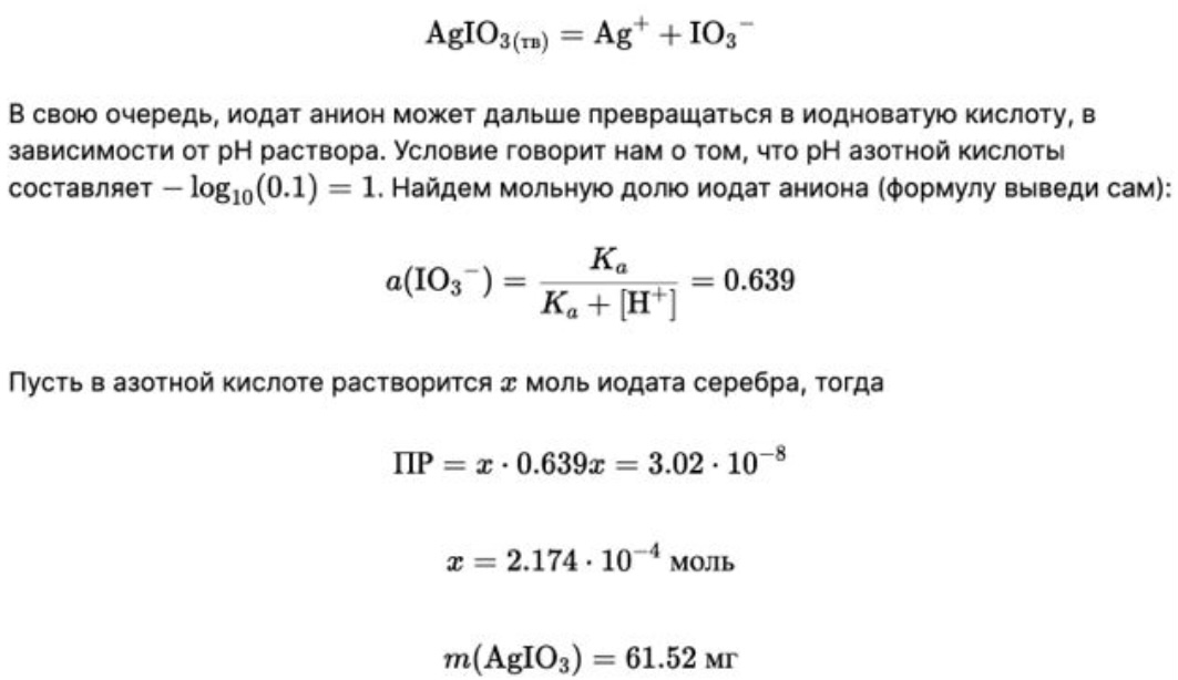 Произведение растворимости йодата серебра равно 3,02 · 10−8. Константа диссоциации йодноватой кислоты равна 1,77 · 10−1. Сколько миллиграммов йодата серебра можно растворить в 1,00 л 0,100 М раствора азотной кислоты?