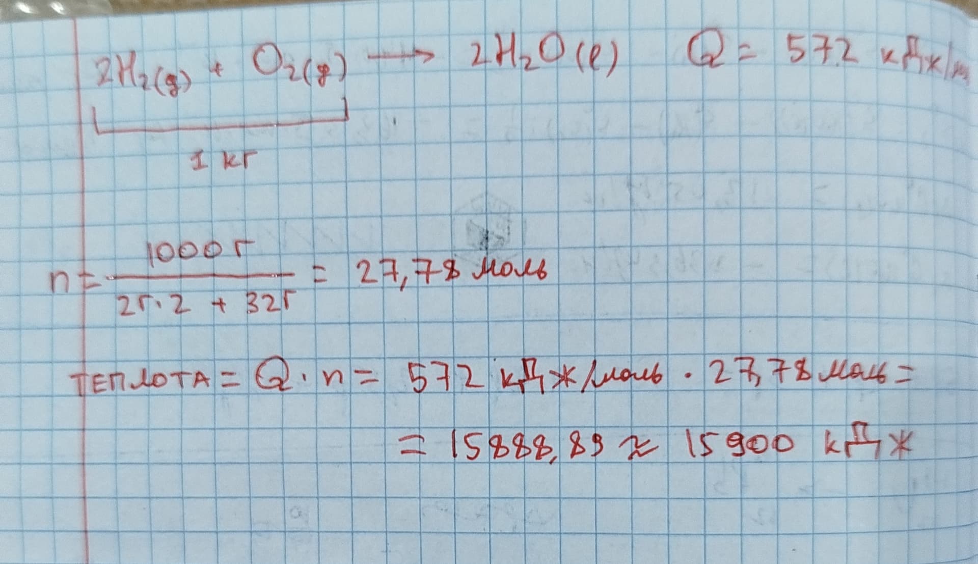 Здесь реакция сгорания водорода, Q= 572 kJ/ mole, я сделал так: 1кг это образовавшиеся 2 молекула вода и нашёл моль и рассчитал теплоту, у меня получилось примерно 15900кДж но ответ другой, помогите решать