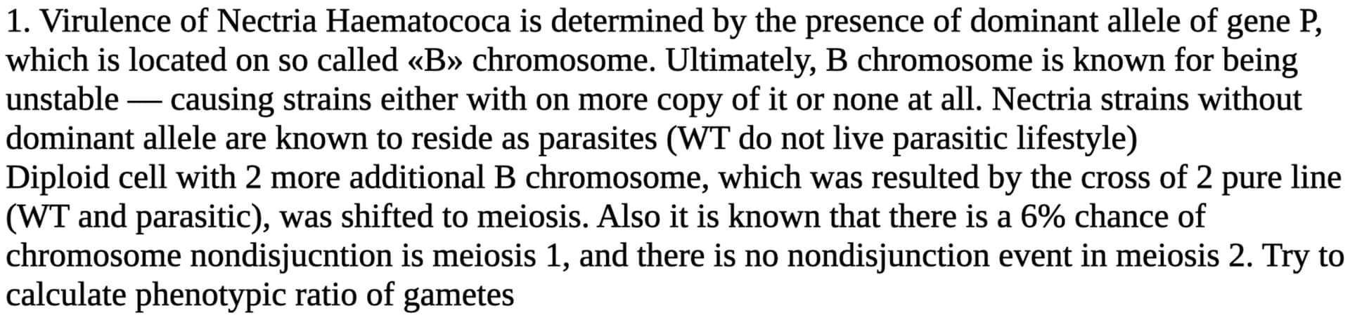 @eudaimon the problem says: virulence of Nectria Haematococa is determined by the presence of dominant allele of gene P, which is located on the so called “B” chromosome. Ultimately, B chromosome is known for being unstable - resulting in strains either with one more copy of it or none at all. Nectria strains without dominant allele are known to reside as parasites (WT do not live parasitic lifestyle). Diploid cell with 2 more additional B chromosome, which was resulted by the cross of 2 pure line (WT and parasitic), was shifted to meiosis. Also it is known that there is a 6% chance of chromosome nondisjunction in meiosis 1, and there is no nondisjunction event in meiosis 2. Try to calculate the phenotypic ratio of gametes.