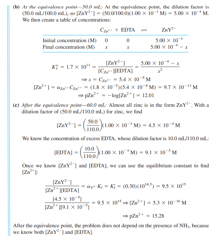я не особо понял почему в (b) автор использует константу в которую уже включена доля цинка, а так же потом домножает полученную концентрацию на долю цинка в растворе опять. Но в пункте (c) этого вообще не делается, даже когда находят концентрацию цинка в растворе, ее не умножают на долю цинка что бы узнать концентрацию цинка не в комплексе