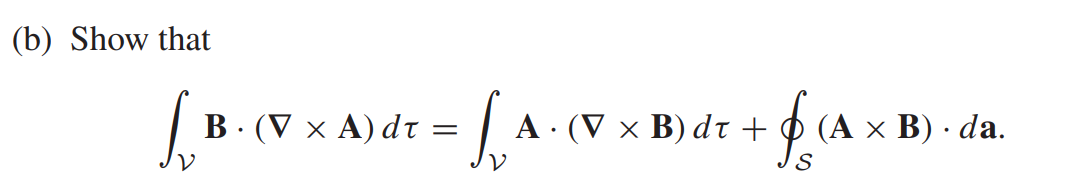 Let’s prove: \int_{\mathcal{V}} \mathbf{B} \cdot (\nabla \times \mathbf{A}) d\tau = \int_{\mathcal{V}} \mathbf{A} \cdot (\nabla \times \mathbf{B}) d\tau + \oint_S (\mathbf{A} \times \mathbf{B}) \cdot d\mathbf{a}