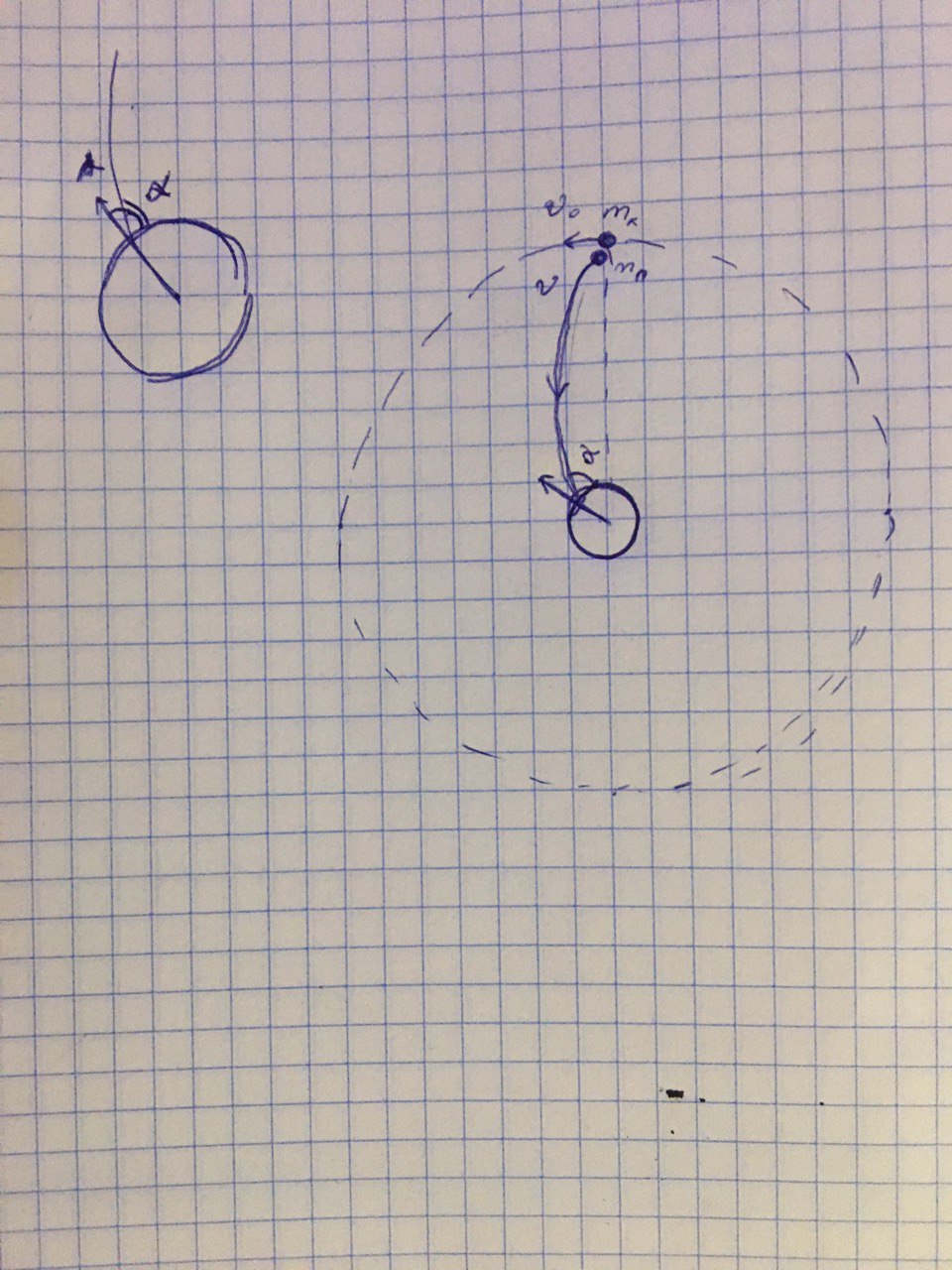 v-это скорость корабля при столкновении с Луной, в полярных координатах его можно разбить на касательную и радиальную компоненту: \vec v=\hat r\dot r+\hat \theta (\dot \theta r)=\hat r(v\sin\alpha)+\hat \theta (v\cos\alpha). Далее можно воспользоваться сохранением момента импульса: L=mr^2\dot \theta =mv_{\theta}r=m_кvR_л\cos\alpha=m_к|\vec v_0+\vec v_п|(3R_л)