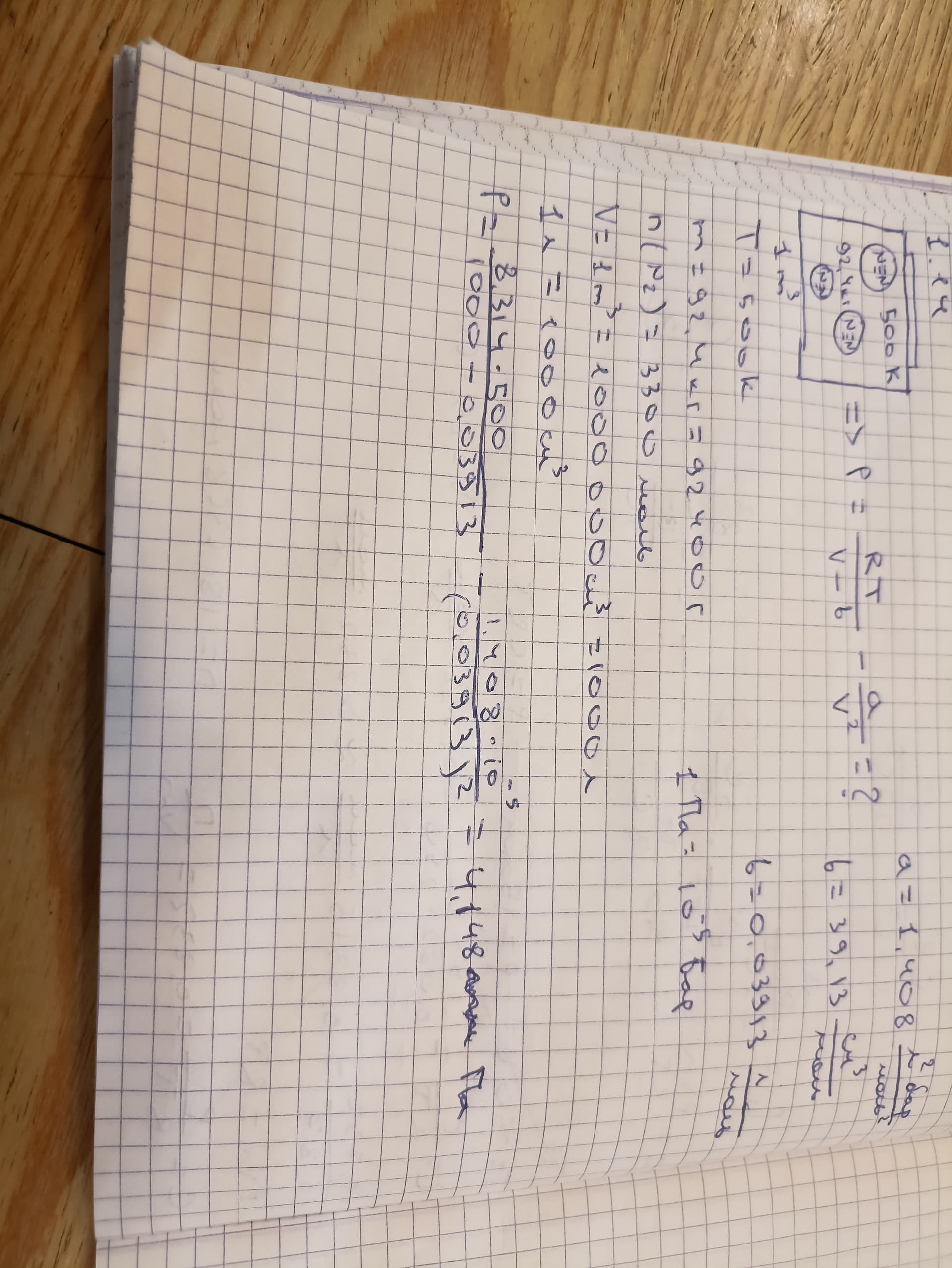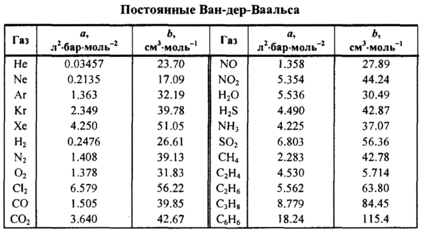 1-14. В некотором промышленном процесса азот нагревают до температуры 500 К в реакторе постоянного объема 1.000 м^3 . Масса газа равна 92.4 кг. Используя уравнение Ван-дер-Ваальса, определите приблизительное давление газа в реакторе при рабочей температуре 500 K. Параметры уравнения Ван-дер-Ваальса см. в табл. П-1.