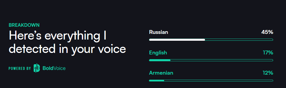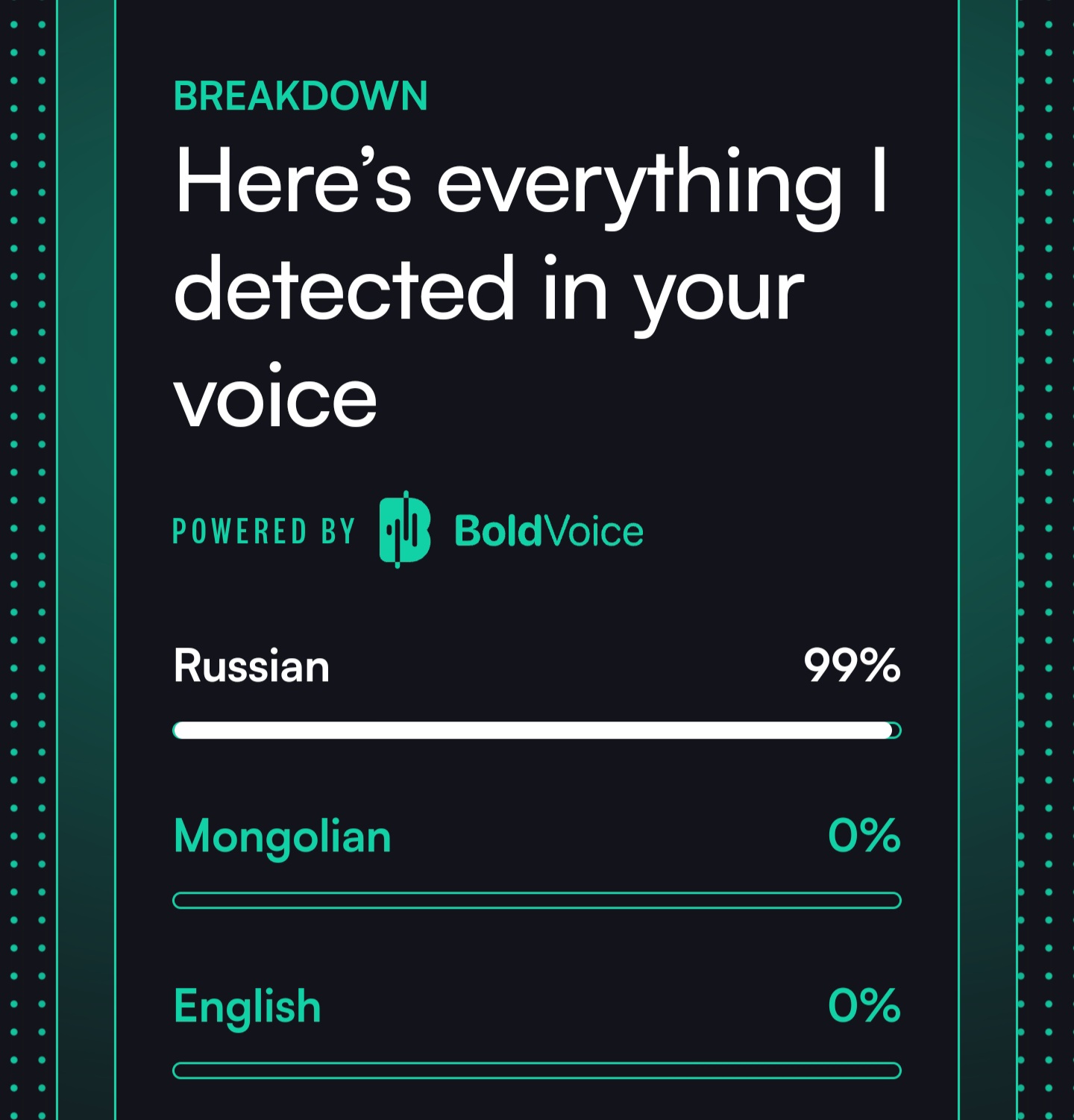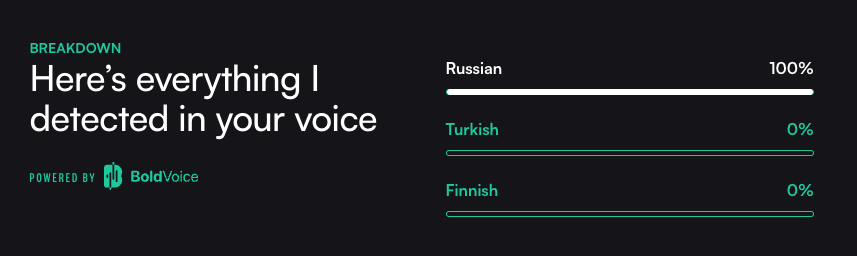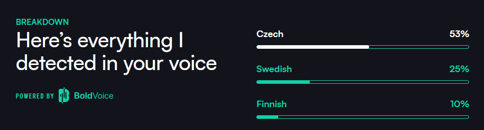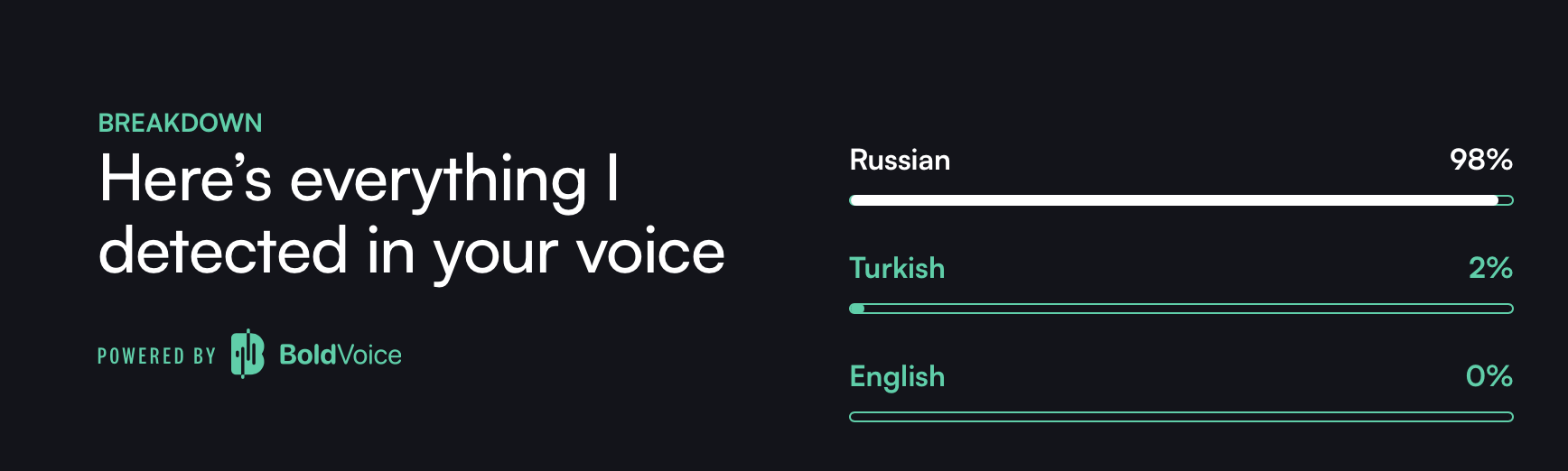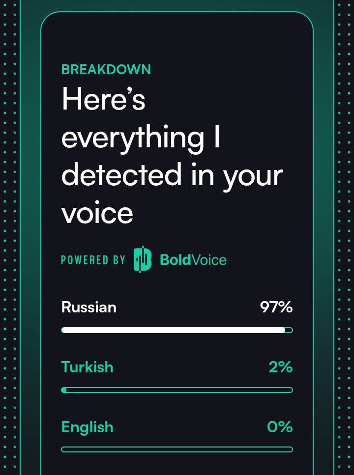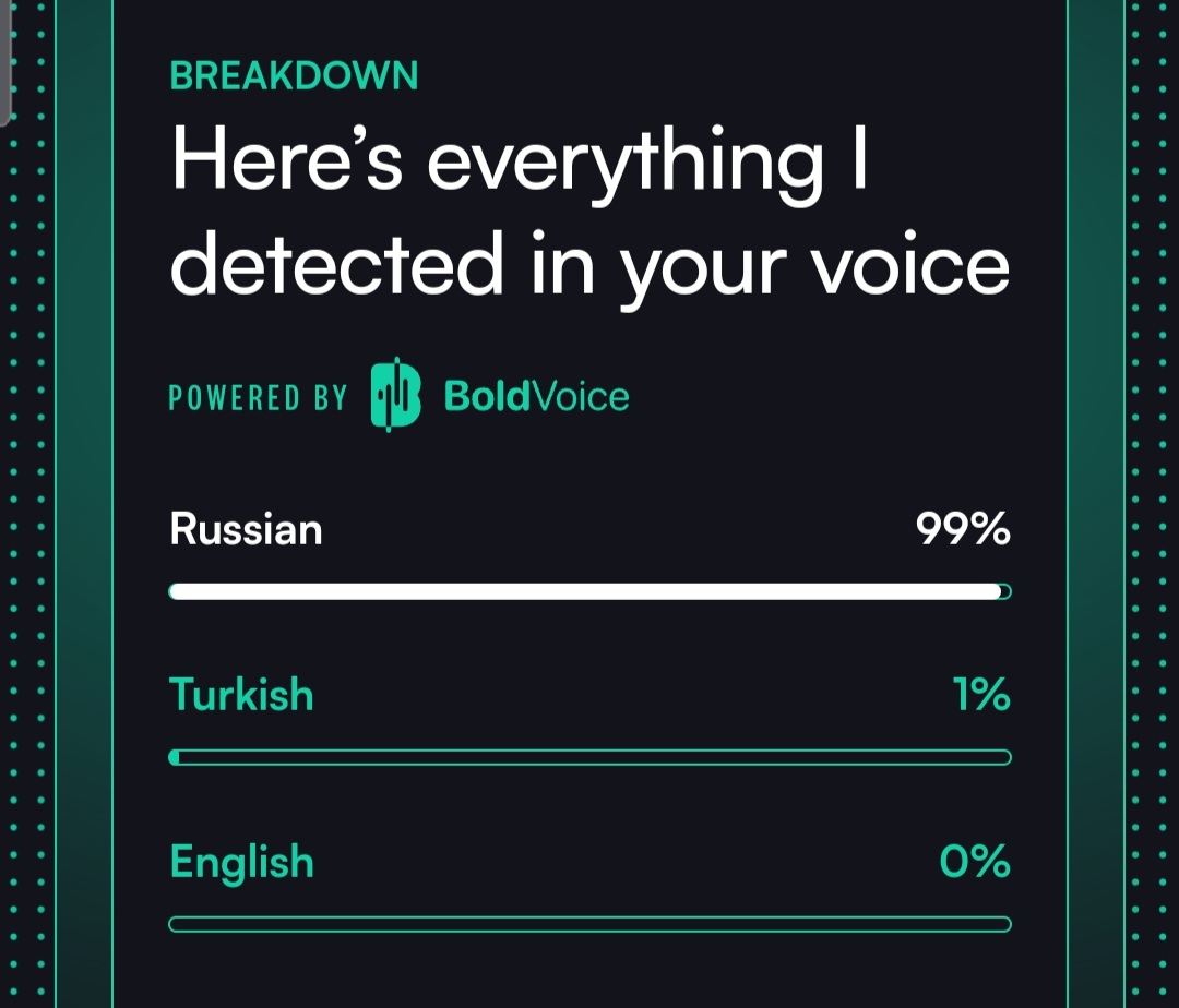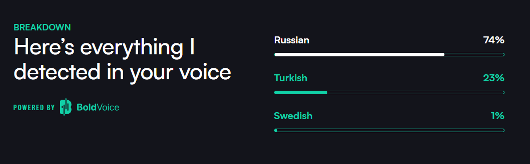 я тоже так пытался, пока не понял, что это не тест того как ты звучишь, а тест того какой твой язык родной. Я так понимаю, что даже если ты 95% слов будешь произносить правильно и в 5% у тебя будут проскальзывать характерные особенности русскоговорящего, он скажет что ты 100% русиш)