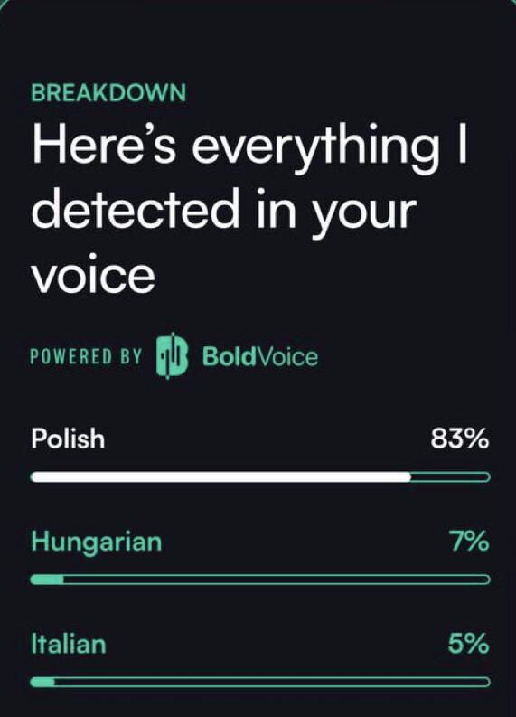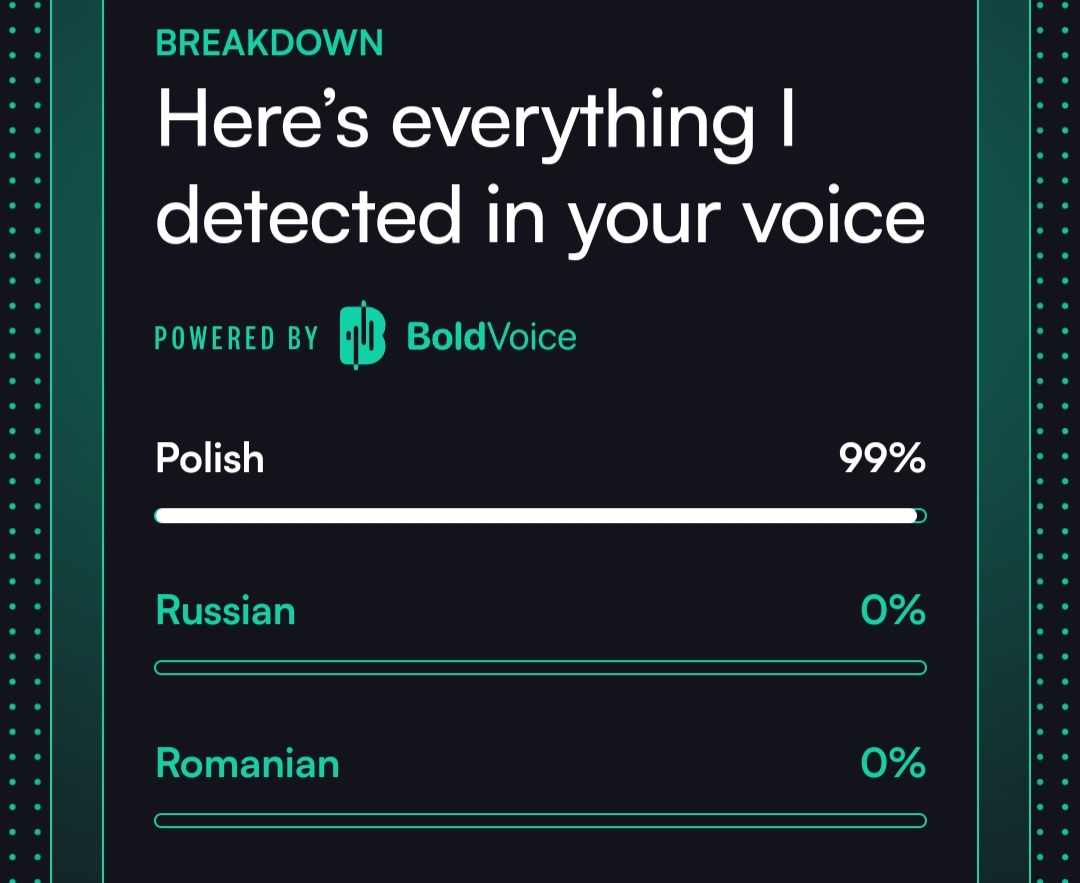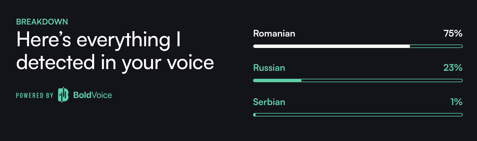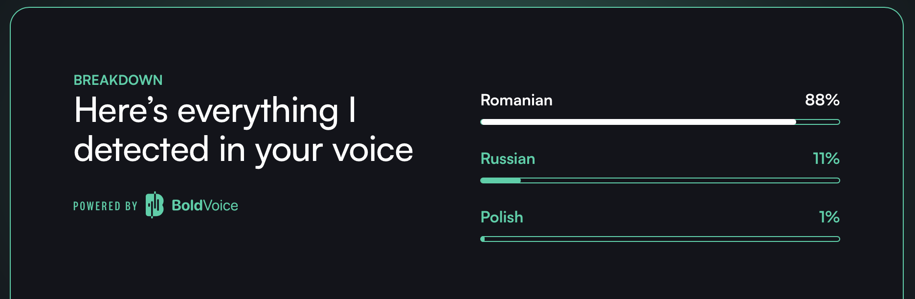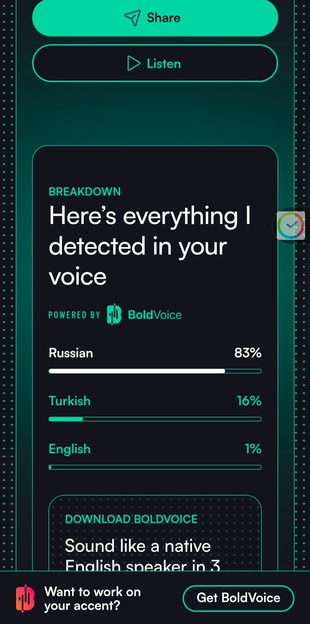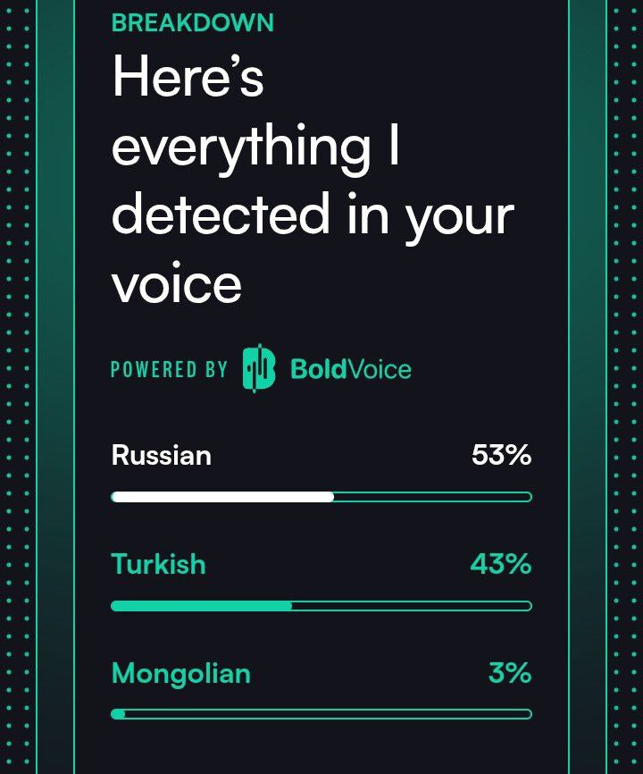я тоже так пытался, пока не понял, что это не тест того как ты звучишь, а тест того какой твой язык родной. Я так понимаю, что даже если ты 95% слов будешь произносить правильно и в 5% у тебя будут проскальзывать характерные особенности русскоговорящего, он скажет что ты 100% русиш)