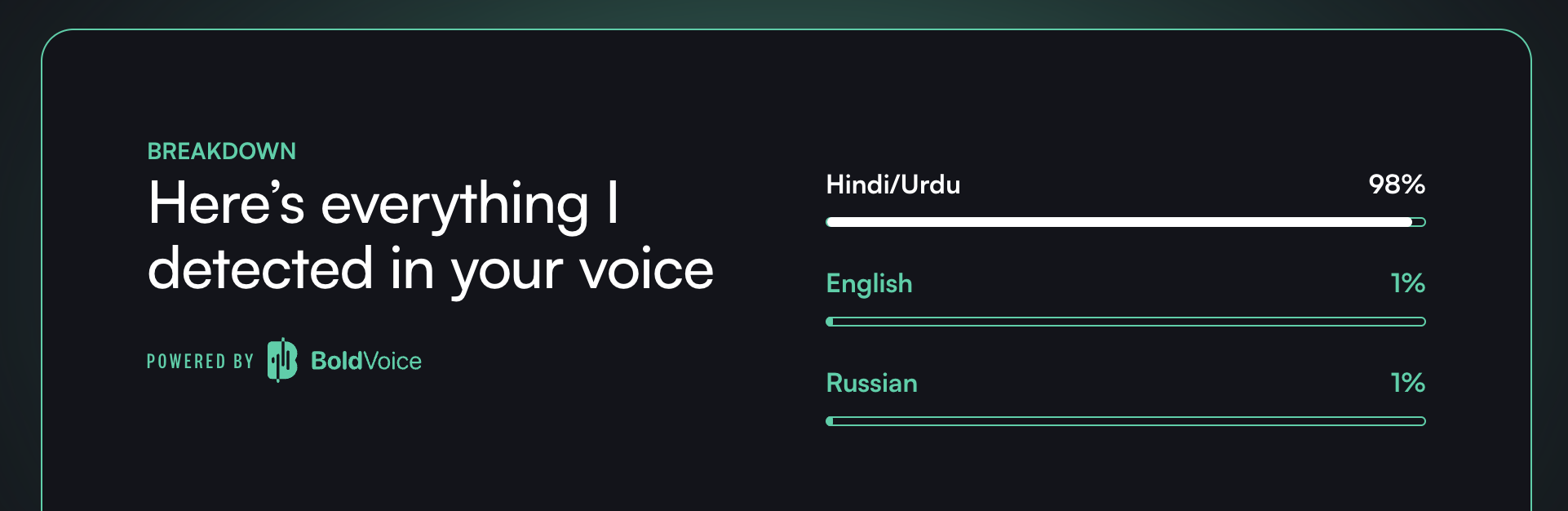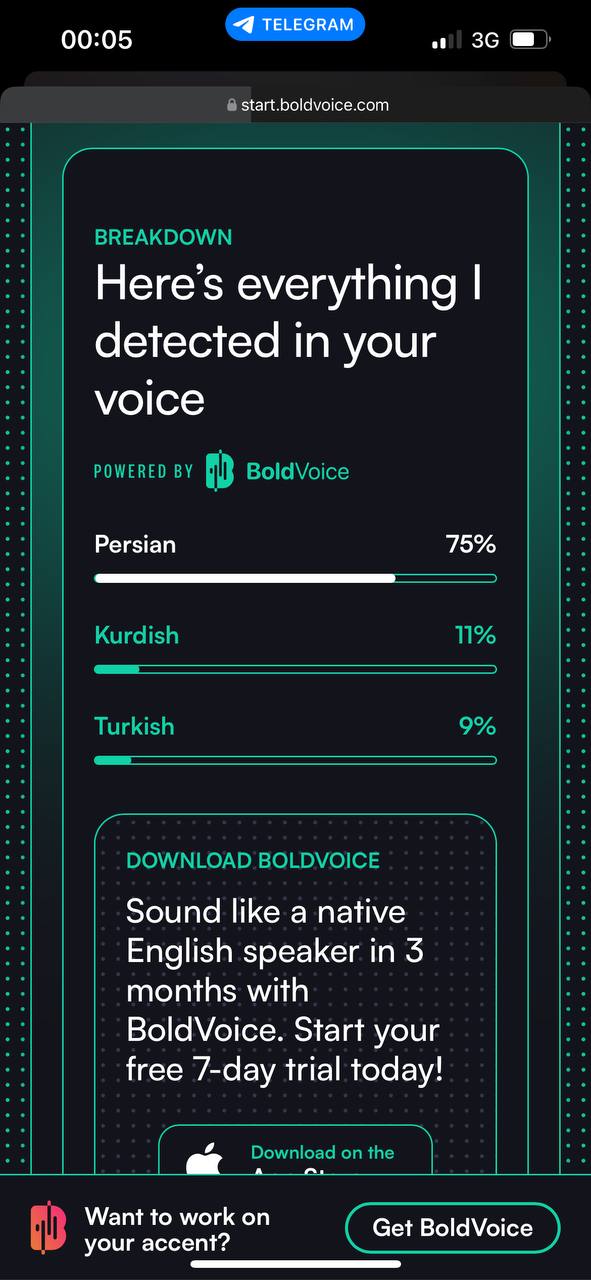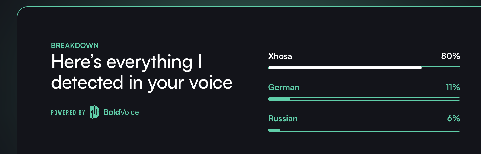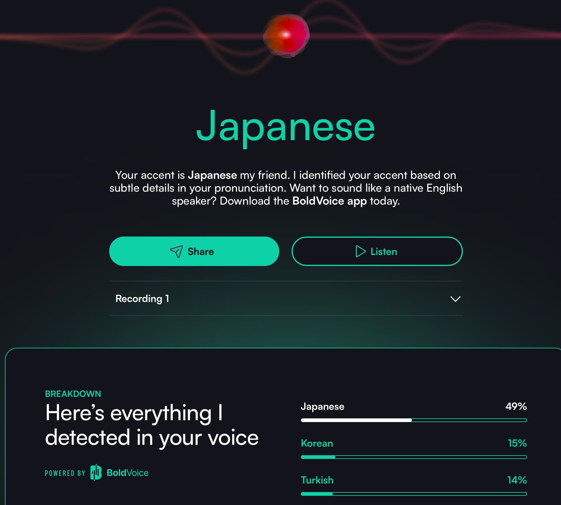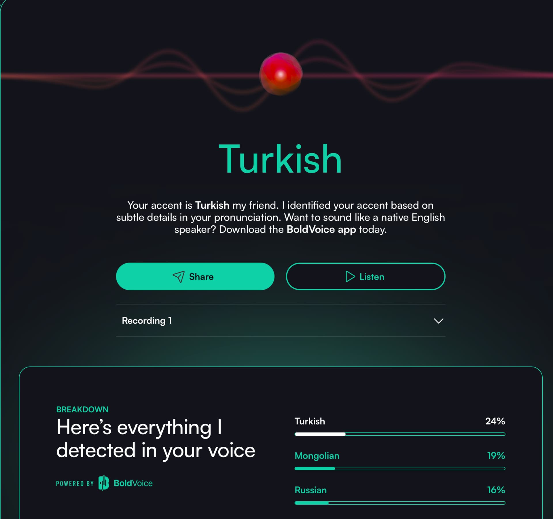 я тоже так пытался, пока не понял, что это не тест того как ты звучишь, а тест того какой твой язык родной. Я так понимаю, что даже если ты 95% слов будешь произносить правильно и в 5% у тебя будут проскальзывать характерные особенности русскоговорящего, он скажет что ты 100% русиш)