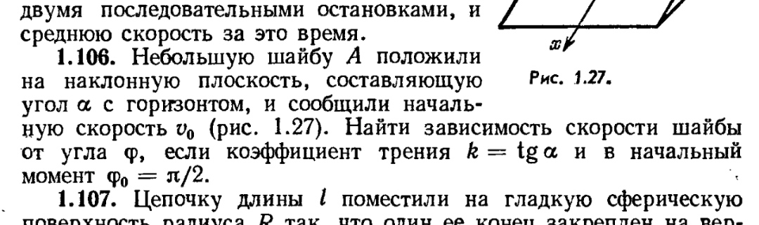 1.106. Небольшую шайбу А положили на наклонную плоскость, составляющую угол \alpha c горизонтом, и сообщили начальную скорость v_0 (рис. 1.27). Найти зависимость скорости шайбы от угла \phi , если коэффициент трения k =tg \alpha и в начальный момент \phi_0 = \pi / 2 .