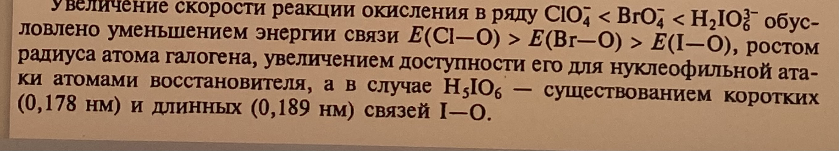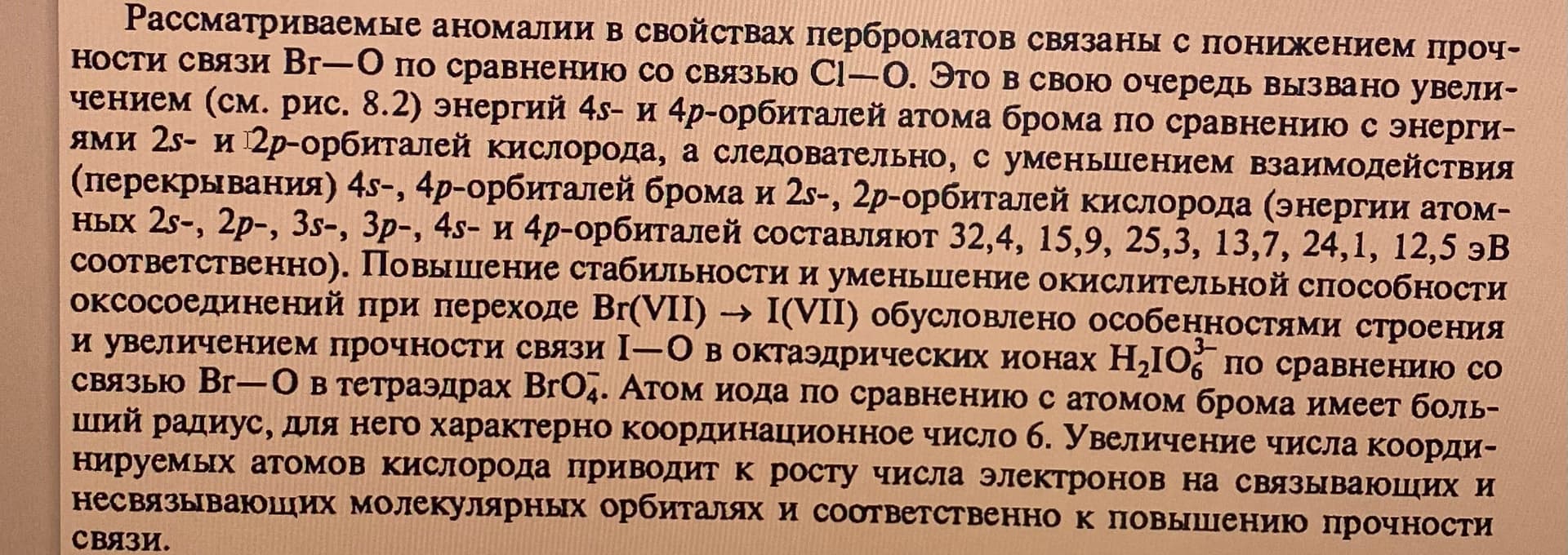Повышение стабильности и уменьшение окислительной способности оксосоединений при переходе \ce{Br(VII)} → \ce{I(VII)} обусловлено особенностями строения и увеличением прочности связи \ce{I-O} в октаэдрических ионах \ce{H2IO6^3-} по сравнению со связью \ce{Br-O} в тетраэдрах \ce{BrO4-}