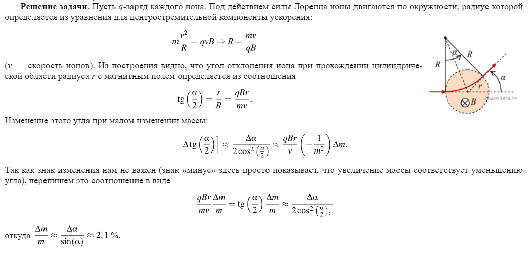 ионов с одинаковым зарядом, но c немного различающимися массами направляют в область цилиндрической формы, в которой создано однородное магнитное поле, направленное по оси цилиндра. Скорость ионов перпендикулярна этой оси. После прохождения области