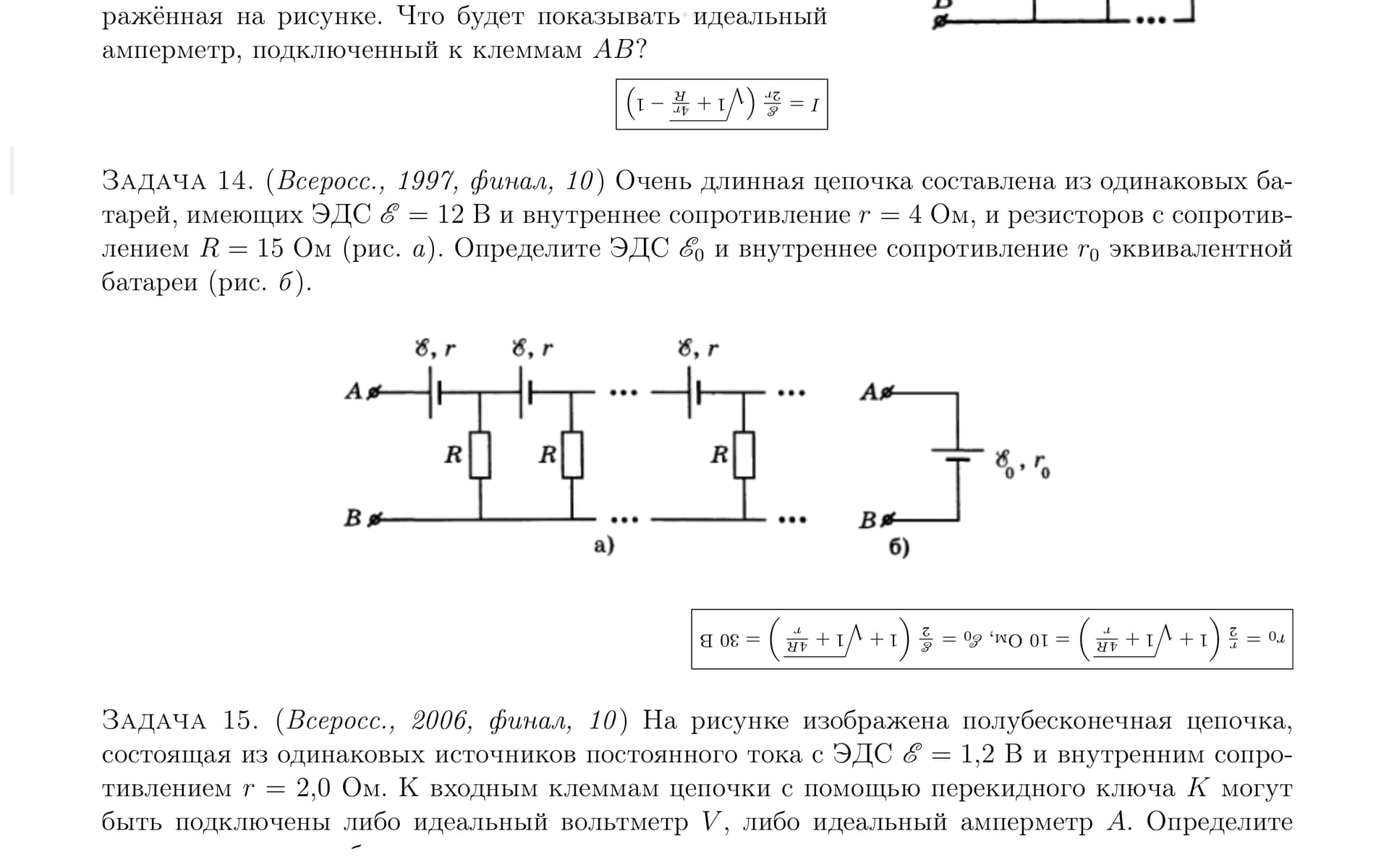 Задача 14. (Всеросс., 1997, финал, 10) Очень длинная цепочка составлена из одинаковых батарей, имеющих ЭДС \xi = 12 В и внутреннее сопротивление r = 15 Ом, и резисторов с сопротивлением R = 15 Ом (рис. а). Определите ЭДС \xi_0 и внутреннее сопротивление r_0 эквивалентной батереи (рис. б).