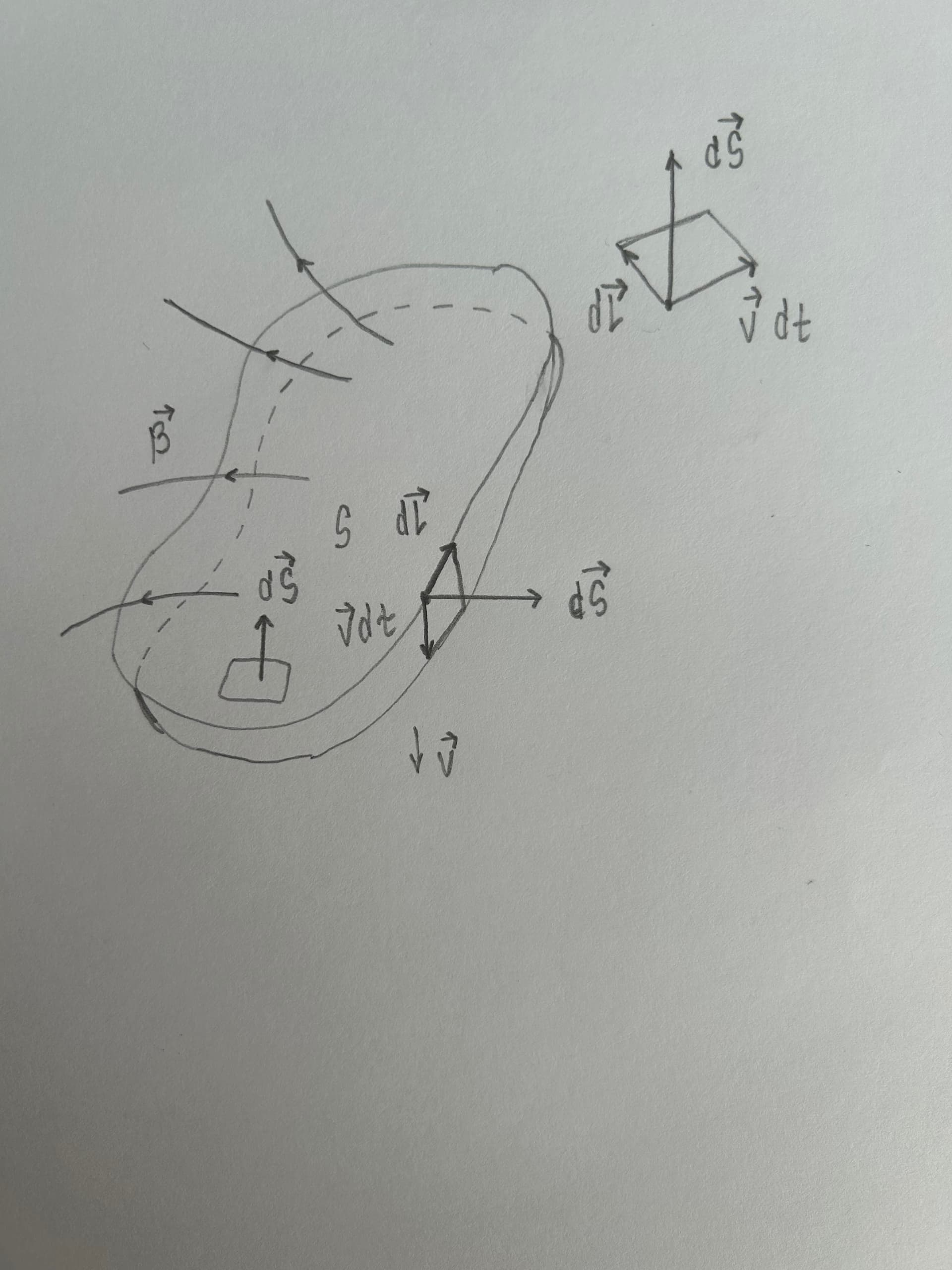 Рассмотрим какой-то контур S, каждый элемент dS которого перемещается со скоростью v в новое положение в интервале времени [t, t+dt]. Магнитный поток через такой контур в момент времени t: