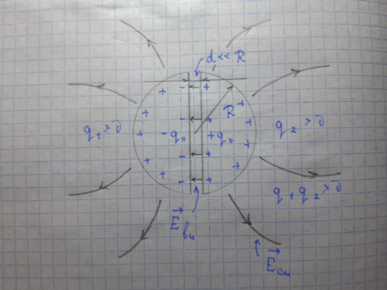 Заряды на полусферах можно рассмотреть как заряды на поверхности целого шара. Поэтому напряженность поля внутри полушаров E_0 = 0, а возле их внешних поверхностей она равна