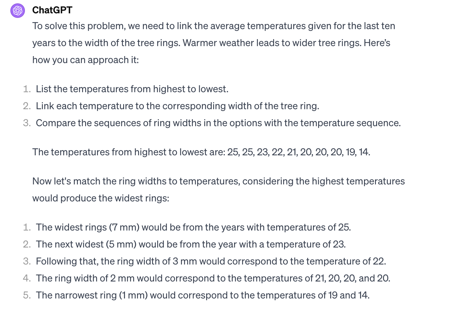 В местности есть constant water supply обеспечивающий width of growth, но этот width of growth растет только если погода теплее чем в прошлом году ( each year increases with warmer weather ). То есть для роста 1) условие water supply есть, 2) чтобы дерево выросло нам нужны года в которых температура была выше года в котором оно выросло в прошлый раз.
