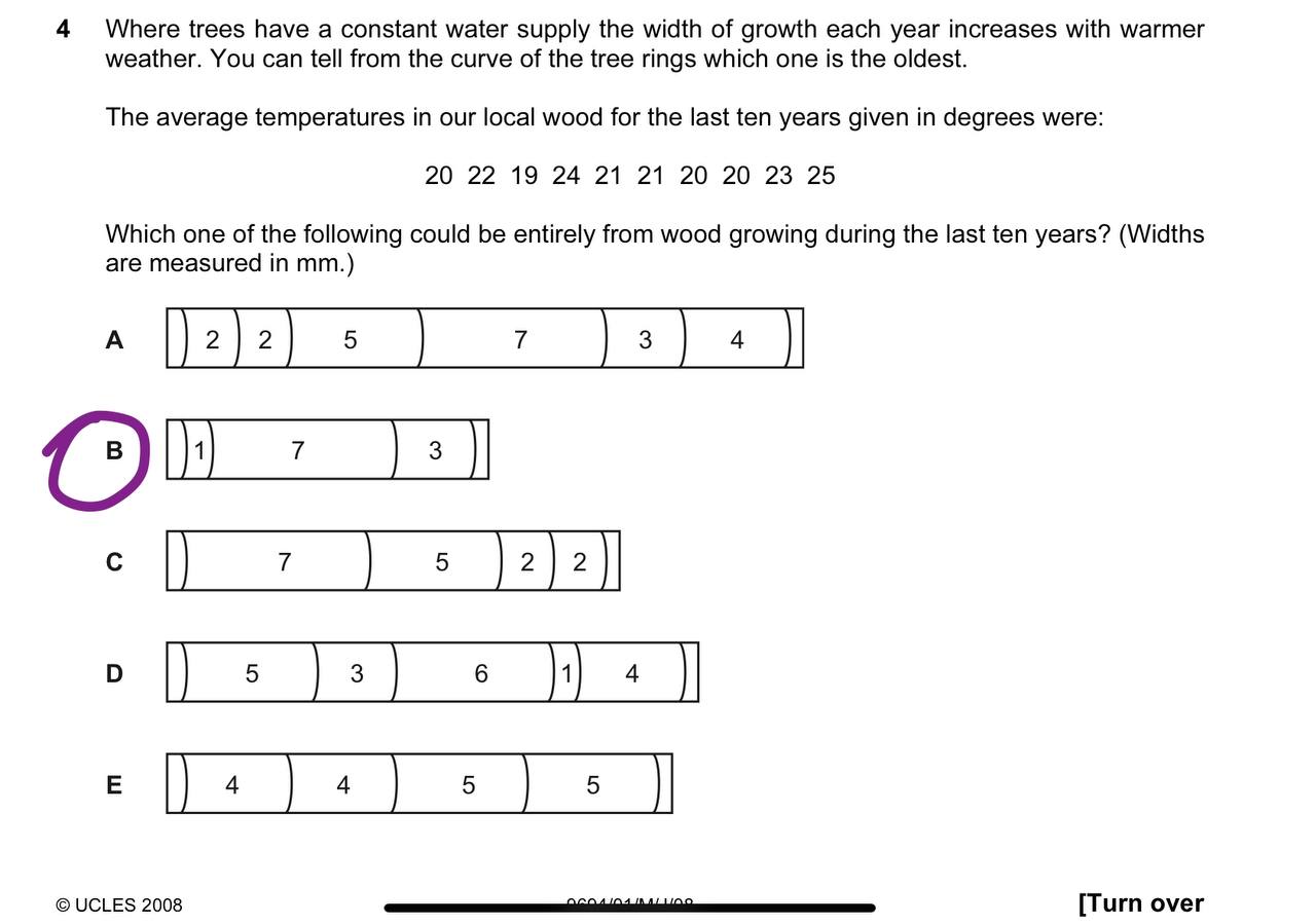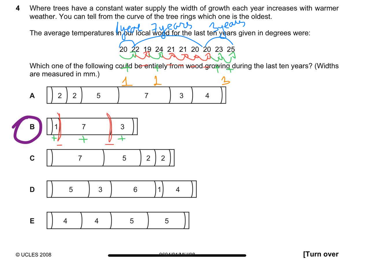 Даже если интерпретировать это так, что рост происходит только если текущий год теплее предыдущего, то я бы смотрел на разницу между двумя соседними годами (и тогда было бы 4 года с ростом), потому что каким боком дерево к 9 году помнит, что 5 лет назад пиковая температура была 24, а щас всего 23, поэтому сори, расти не буду.