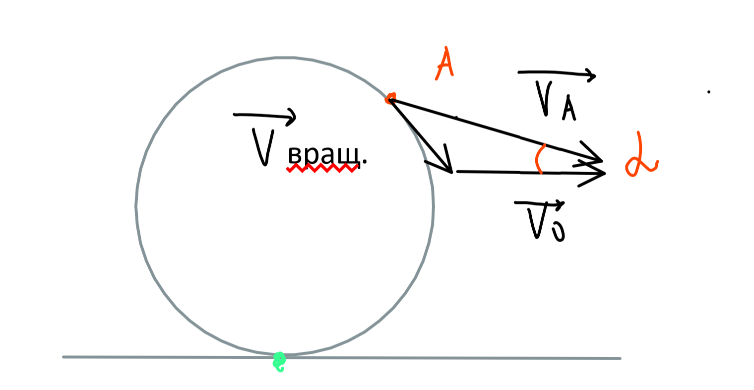 Угол \alpha между вектором полной скорости и направлением поступательного движения его центра находится через треугольник, получающийся векторным сложением скоростей:
