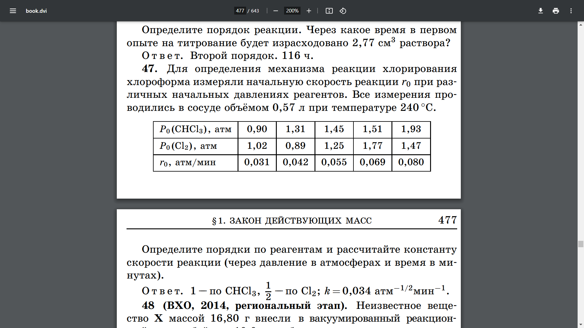 47. Для определения механизма реакции хлорирования хлороформа измеряли начальную скорость реакции r_0 при различных начальных давлениях реагентов. Все измерения проводились в сосуде объемом 0,57 л при температуре 240°С.