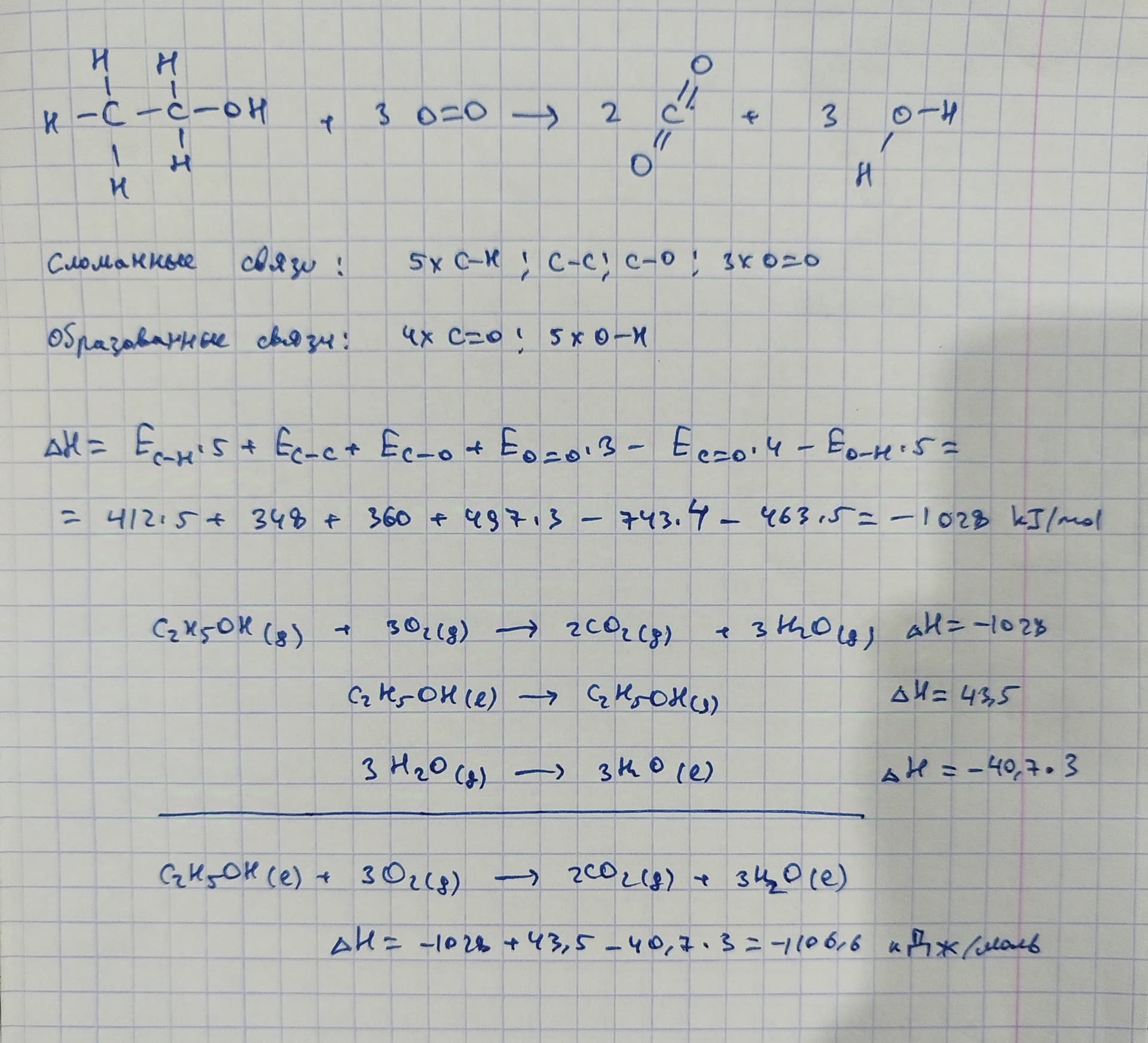 Но сейчас ответ вышло другой, я сначала забыл там энергия связи С–С. Реально ответ не выйдет (имхо), это из за данных по моему, потому что в каком то книге читал что там энергия О–Н связи в обычном спирте различается с О–Н в воде, так что надо посмотреть решения (если не ошибаюсь, есть решебник этой книги), потом будет все ясно. Ещё я решал с энтальпиями образования, тогда вышлю примерно -1366 кДж/моль
