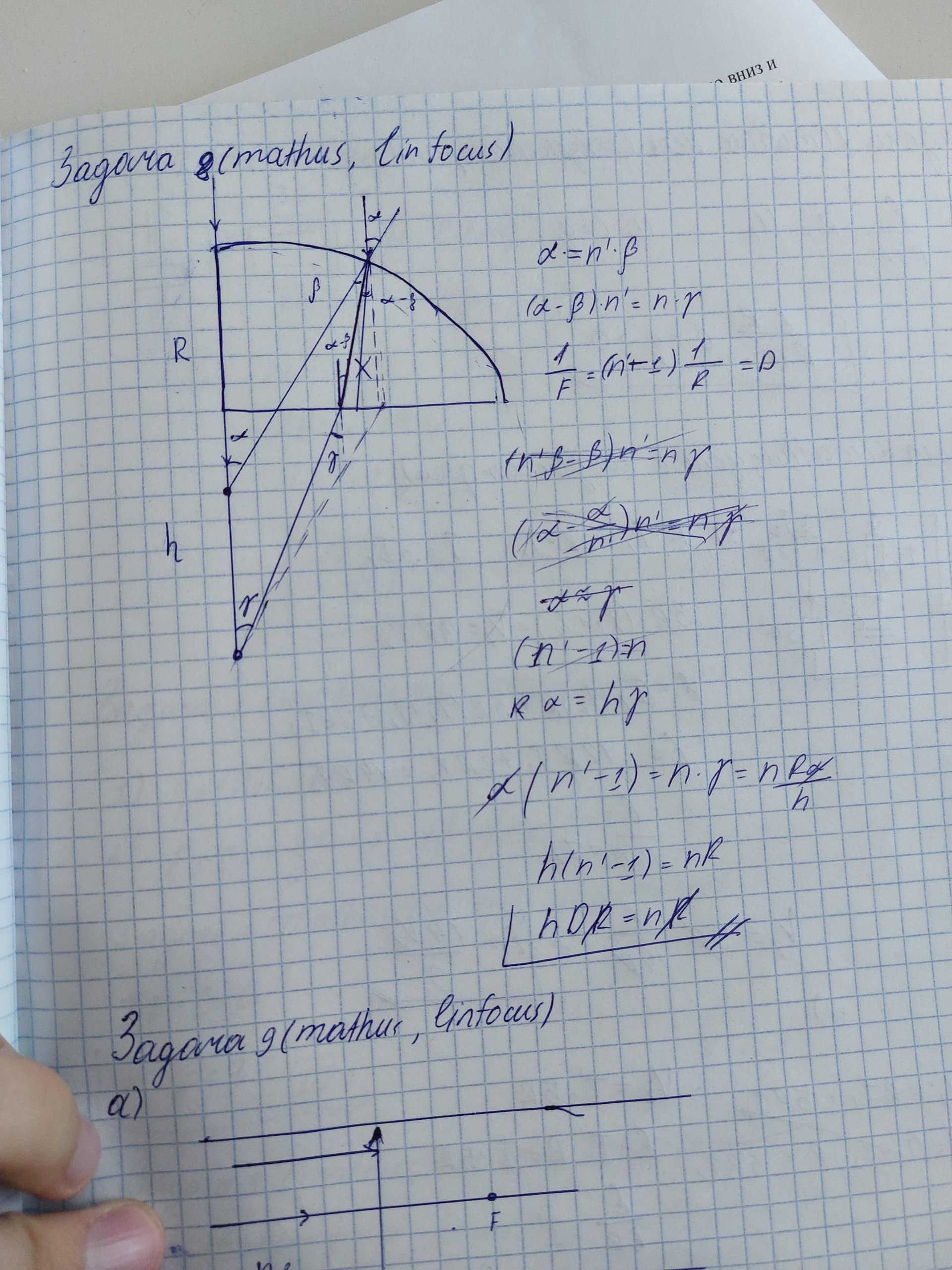 А здесь по-разному можно подступиться. Можешь и вот этим методом – правда, ты забыл кое-какое соотношение, которое свяжет R и h через твои углы, откуда ты можешь правильный ответ получить (подумай где проблема, и добей до конца сам). А можешь, например, через равенство оптических путей между прямым и немного отклонённым лучами (см. например, здесь).