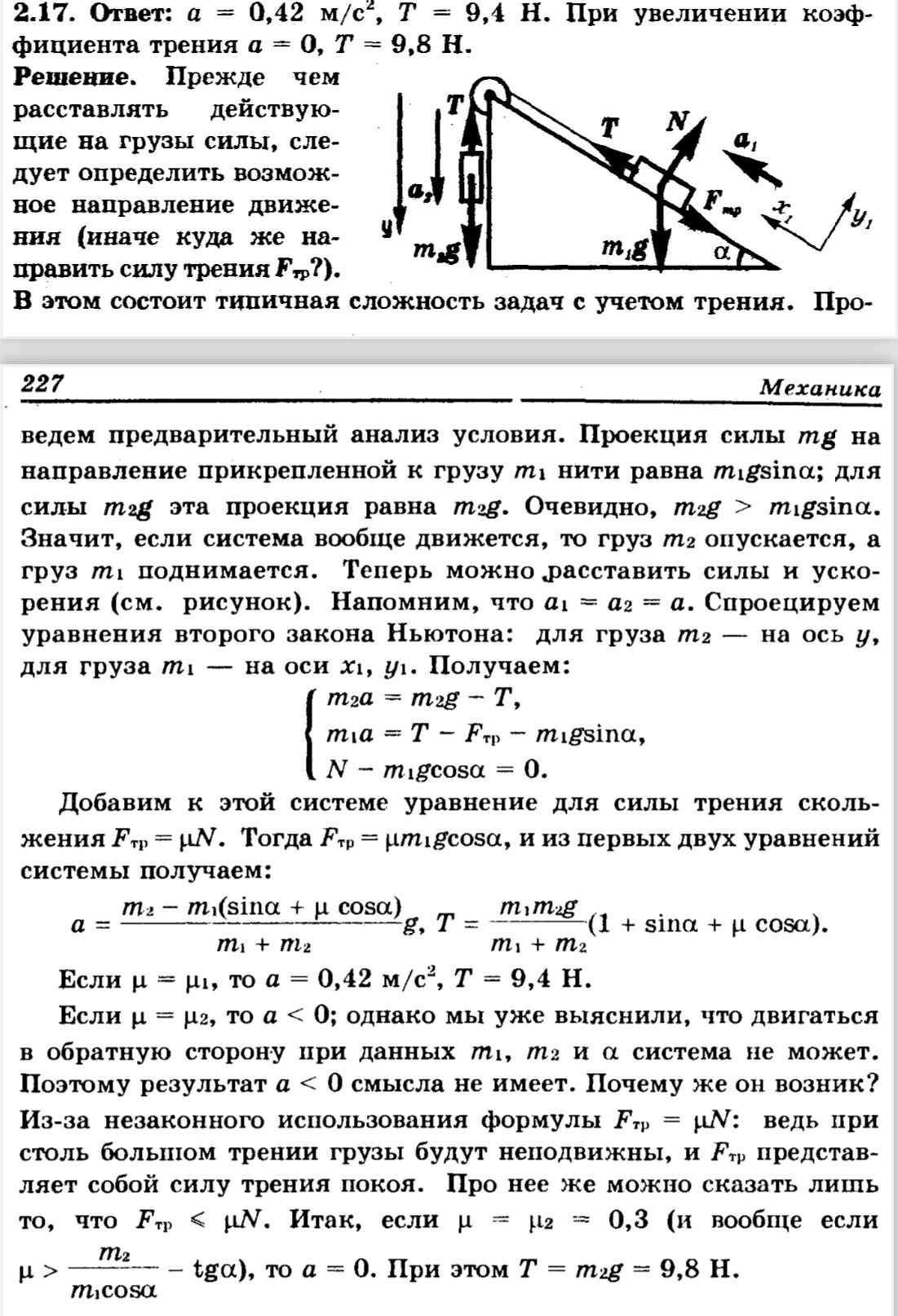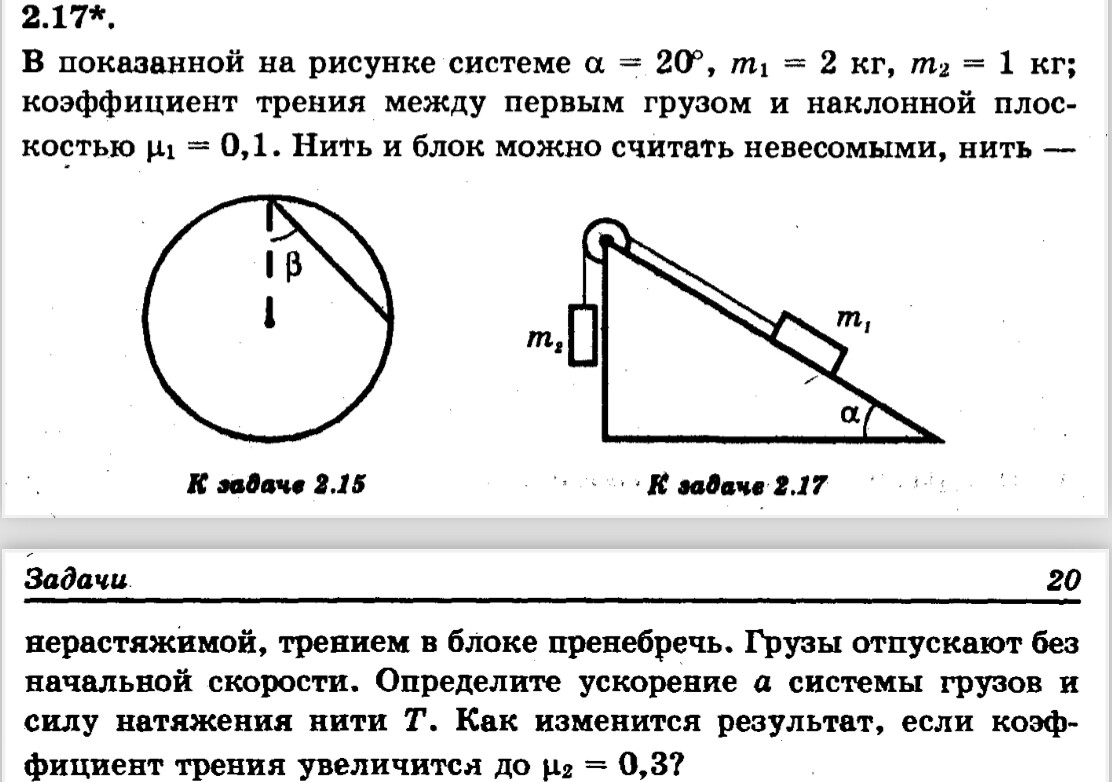 В доказанной на рисунке системе а = 20°, m1 = 2 кг, m2 = 1 кг; коэффициент трения между первым грузом и наклонной плоскостью нг = 0,1. Нить и блок можно считать невесомыми, нить — нерастяжимой, трением в блоке пренебречь. Грузы отпускают без начальной скорости. Определите ускорение а системы грузов и силу натяжения нити Т. Как изменится результат, если коэффициент трения увеличится до Н2 = 0,3