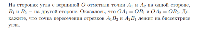 Можете подсказать, как правильнее решить эту задачу? Я пытался опираться на то, что биссектриса это ГМТ, равноудаленных от сторон угла, тогда, соответственно, если точка пересечения отрезков будет лежать не на биссектрисе, то она не будет равноудалена от B1, A1, B2, A2 и тогда OA1 не будет равно OB1 и аналогично с другими точками, но есть сомнения по поводу правильности последних пунктов, так как не знаю как их можно доказать.