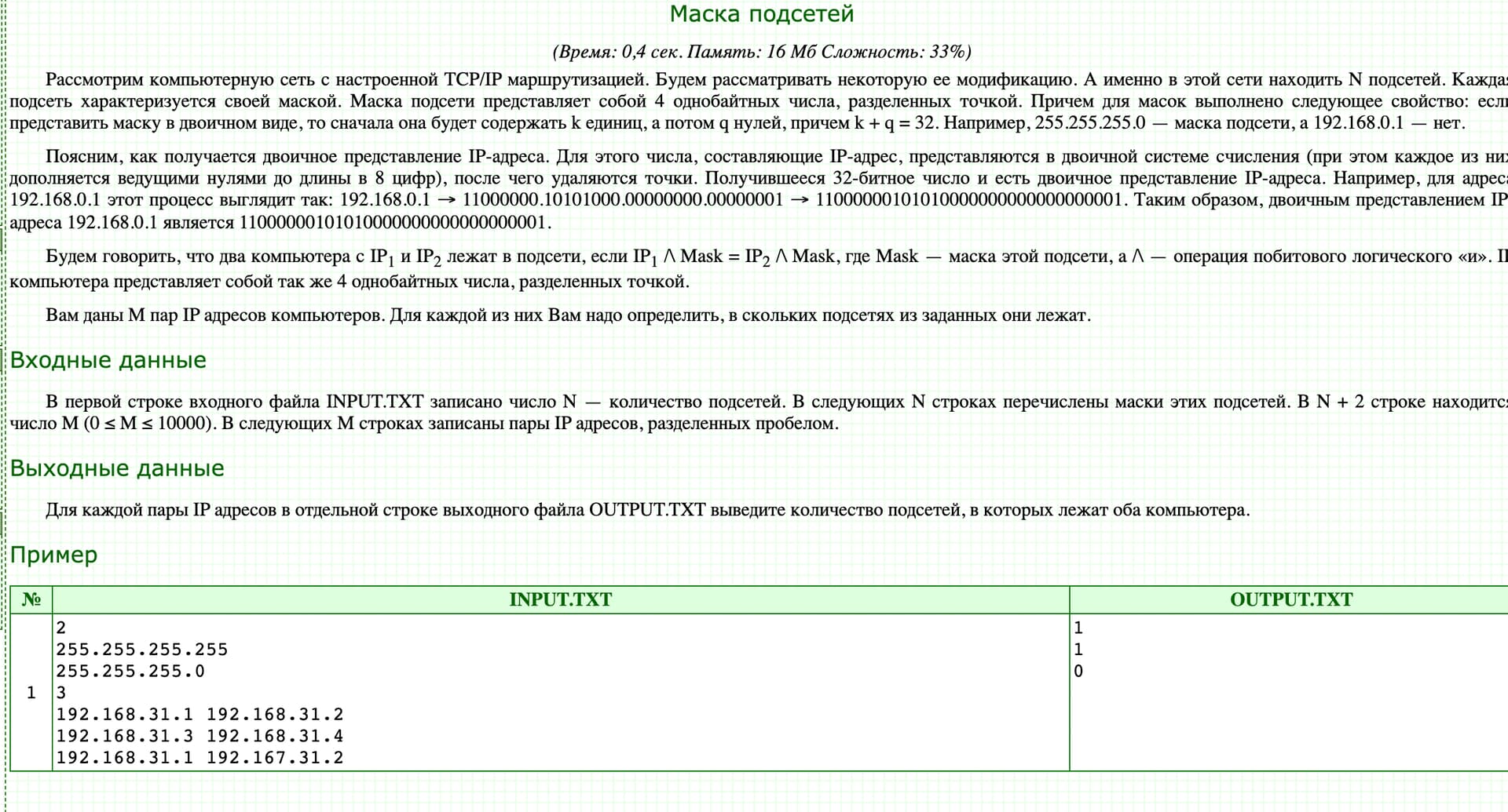 Скорее всего ты хранил двоичное число в явном виде из 0 и 1, и делал операцию “и” вручную. Для того чтобы решение проходило по тлу нужно хранить числа в виде числа, и использовать встроенные логические операции.