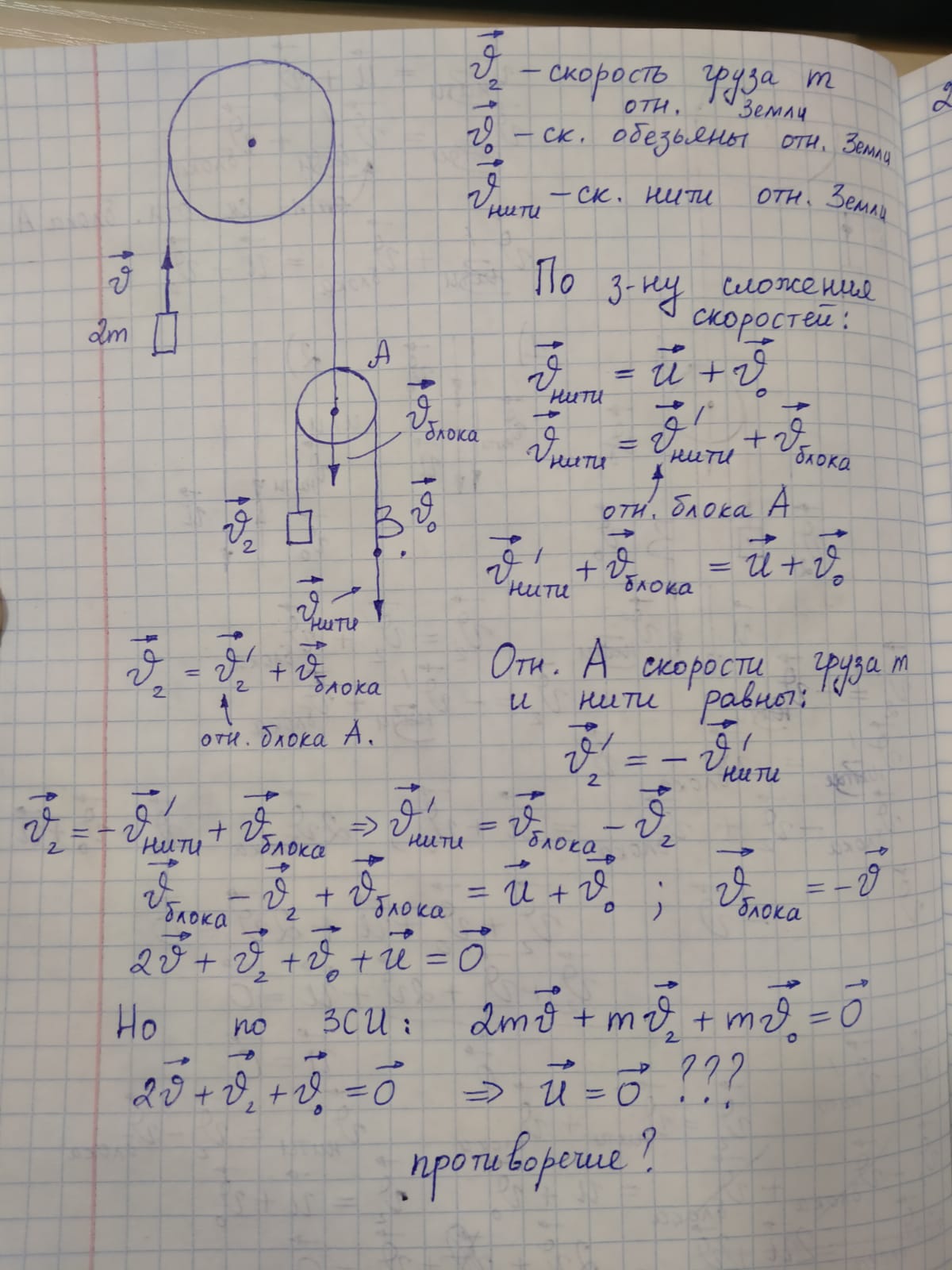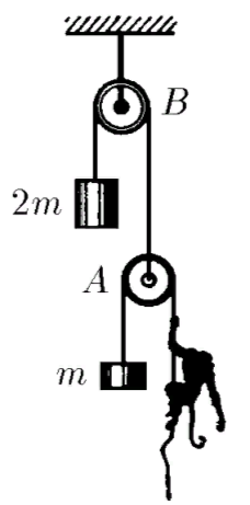 Обезьяна массы m уравновешена противовесом на блоке А. Блок А уравновешен грузом массы 2m на блоке B. Система неподвижна. Как будет двигаться груз, если обезьяна начнет равномерно выбирать веревку со скоростью u относительно себя? Массой блоков и трением пренебречь.