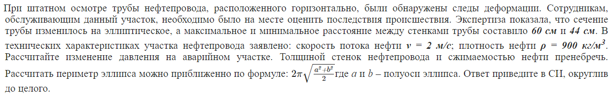 При штатном осмотре трубы нефтепровода, расположенного горизонтально, были обнаружены следы деформации. Сотрудникам, обслуживающим данный участок, необходимо было на месте оценить последствия происшествия. Экспертиза показала, что сечение трубы изменилось на эллиптическое, а максимальное и минимальное расстояние между стенками трубы составило 60 см и 44 см. В технических характеристиках участка нефтепровода заявлено: скорость потока нефти v = 2 м/с ; плотность нефти ρ = 900 кг/м3. Рассчитайте изменение давления на аварийном участке. Толщиной стенок нефтепровода и сжимаемостью нефти пренебречь. Рассчитать периметр эллипса можно приближенно по формуле: (формула на картинке) , где a, b– полуоси эллипса. Ответ приведите в СИ, округлив до целого.