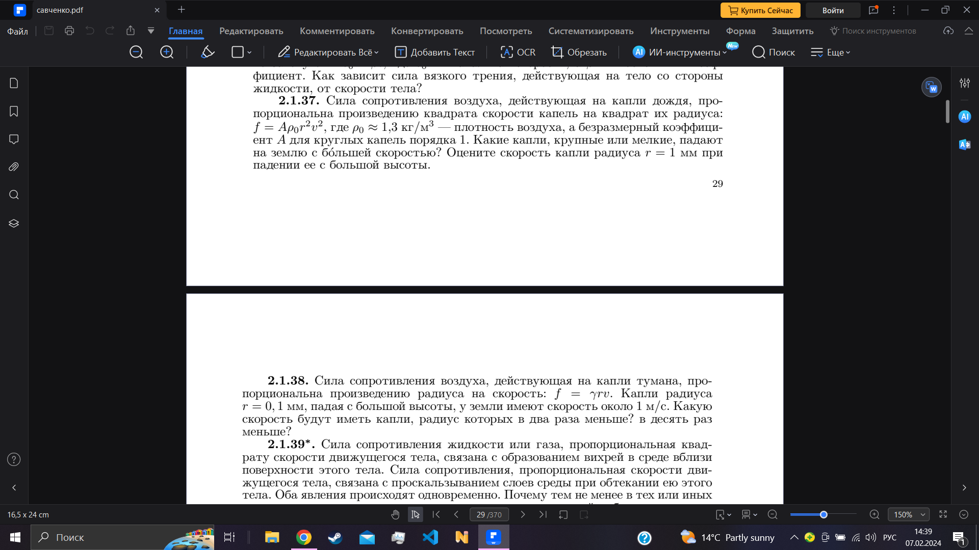 Сила сопротивления жидкости или газа, пропорциональная квадрату скорости движущегося тела, связана с образованием вихрей в среде вблизи поверхности этого тела. Сила сопротивления, пропорциональная скорости дви- жущегося тела, связана с проскальзыванием слоев среды при обтекании ею этого тела. Оба явления происходят одновременно. Почему тем не менее в тех или иных условиях можно принимать во внимание только один какой-либо вид сопротив- ления? По данным двух предыдущих задач оцените, при каком значении произ- ведения радиуса круглой капли на ее скорость оба вида сопротивления воздуха сравнимы по своему воздействию на движение капли.