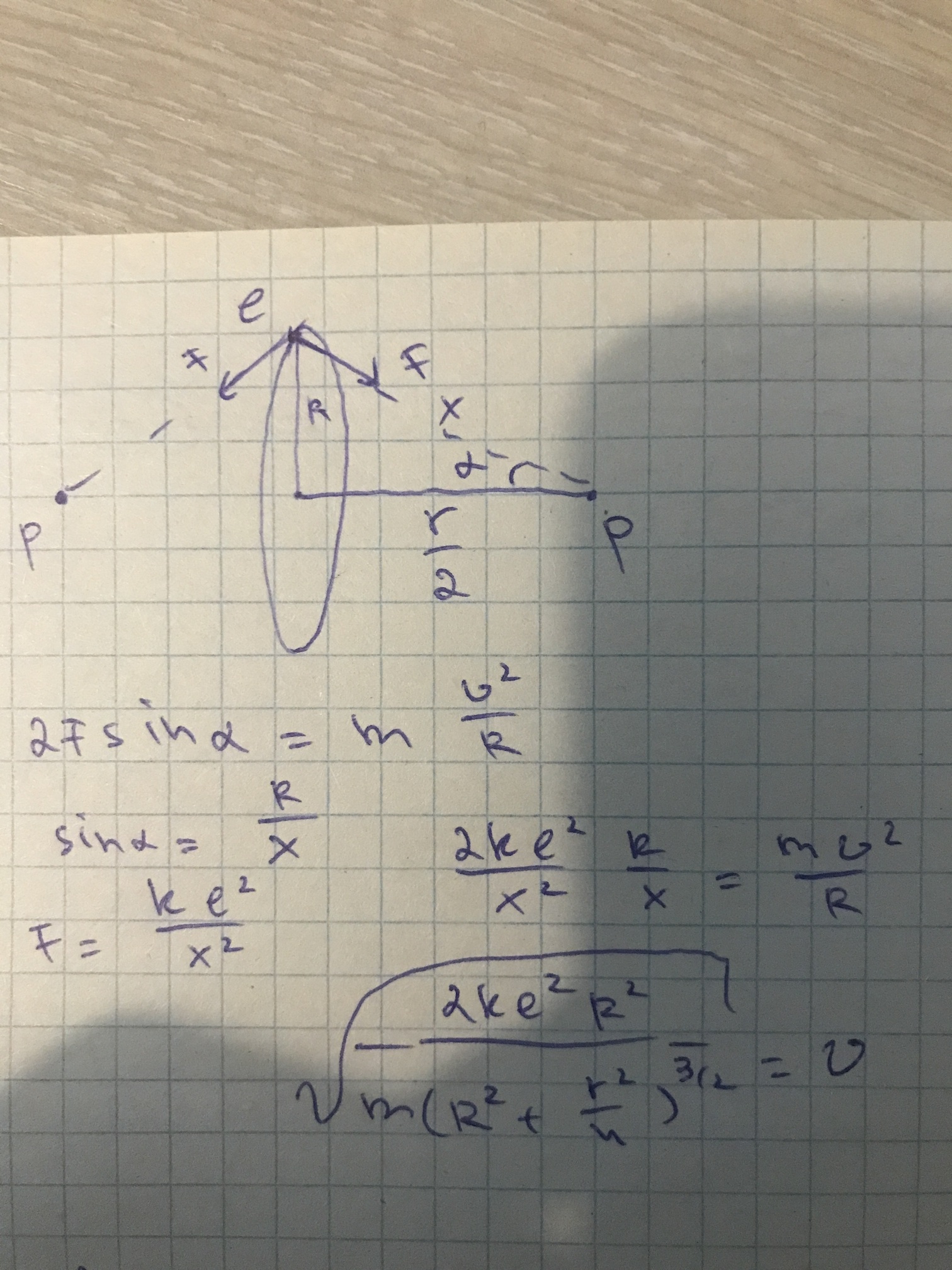 соединяющей протоны. Расстояние между протонами равно r, заряд электрона — e, его масса — m. Найти скорость, с которой движется электрон.