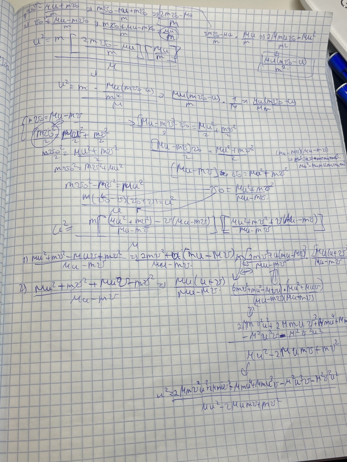 Спасибо, а как можно выразить из системы импульса и энергии формулу которую они получили u=2mv0/M+m?