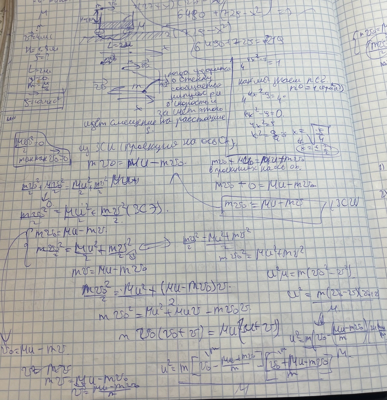 Составил правильную систему ЗСИ, ЗСЭ для тел (шарик, тележка) но не могу получить окончательный ответ для скорости тележки: u=2mv0/M+m=0,2v0